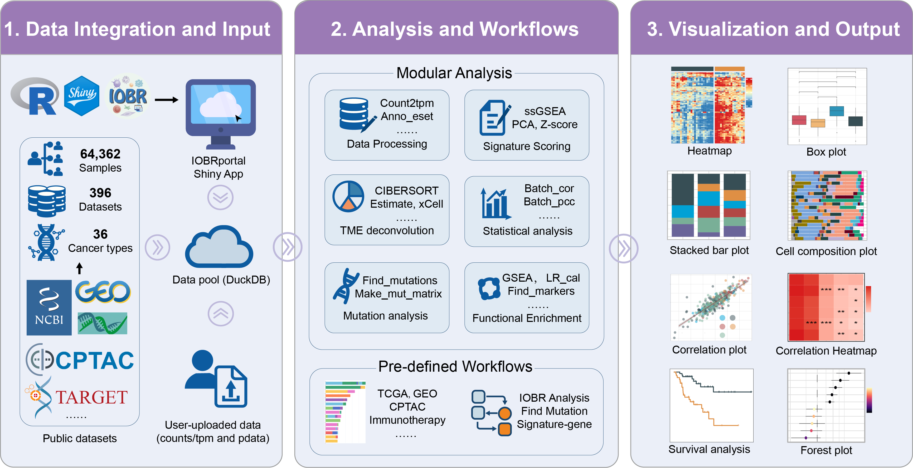 IOBRportal is a Shiny-based, cloud-deployable web platform built on the IOBR ecosystem to deliver an end-to-end, user-friendly environment for immuno-oncology and bulk transcriptome analyses. It unifies database-backed curated cohorts with user-uploaded datasets, and provides two complementary entry modes—Functions (stepwise, modular analysis) and Workflows (pre-defined, guided pipelines)—to support efficient and reproducible TME-centric investigations.
